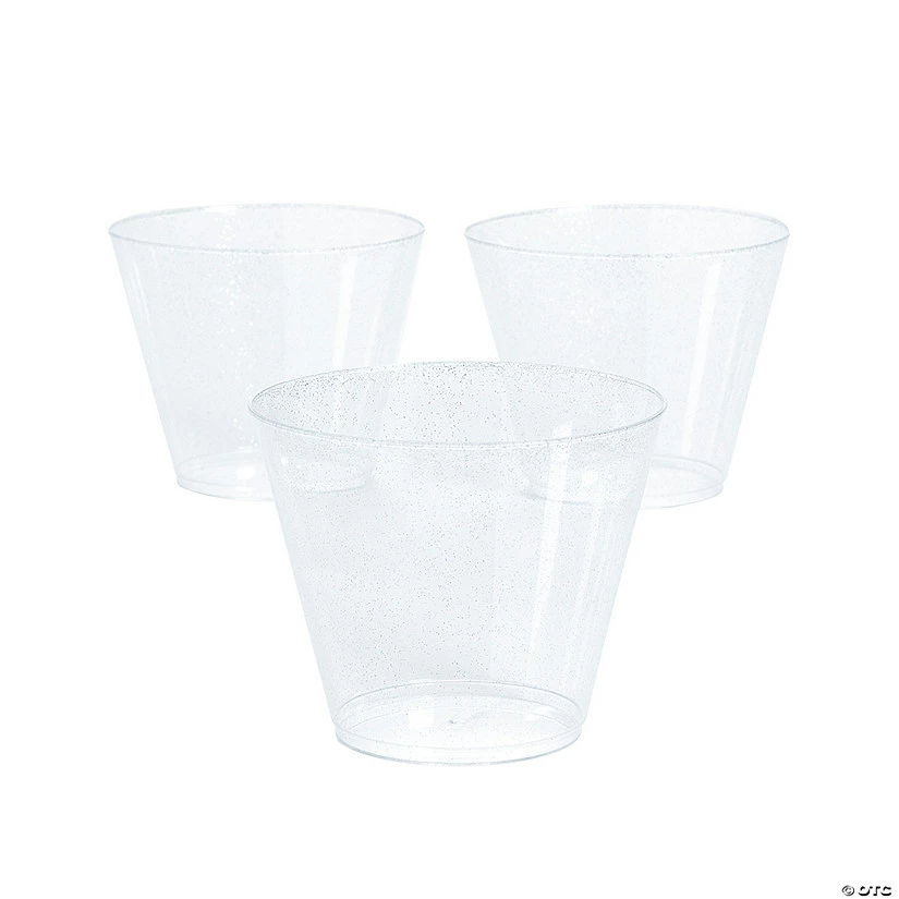 These plastic cups add an elegant splash of sparkle to your party supplies. Use these sparkly cups to serve beverages or small portions of snacks at a wedding reception, New Yearβs Eve party, holiday celebration, princess party, birthday bash and more! (50 pcs. per unit) 2 3/4″ 9 oz.